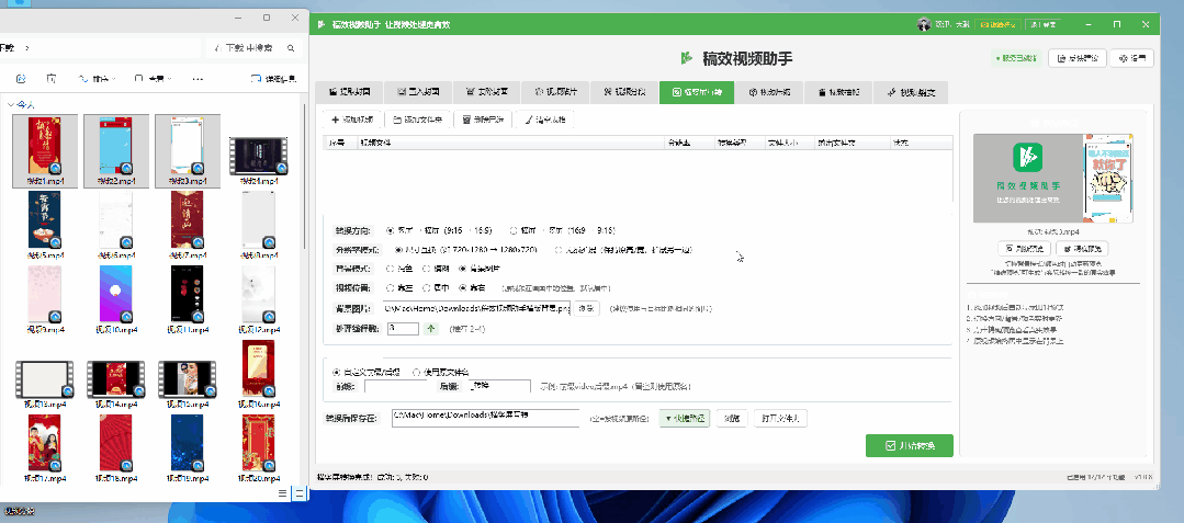 支持竖屏转横屏(9:16→16:9)或横屏转竖屏(16:9→9:16)。可选择尺寸互换或无损扩展,背景支持纯色、模糊或自定义图片,视频位置可左、中、右调整,完美适配抖音、快手、视频号等平台。