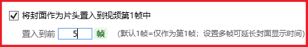 在「将封面作为片头置入」选项中,可输入想要的时长(如 1 帧、5帧等),软件将按照设置,让封面在视频开头固定显示对应时间,适配平台播放体验。