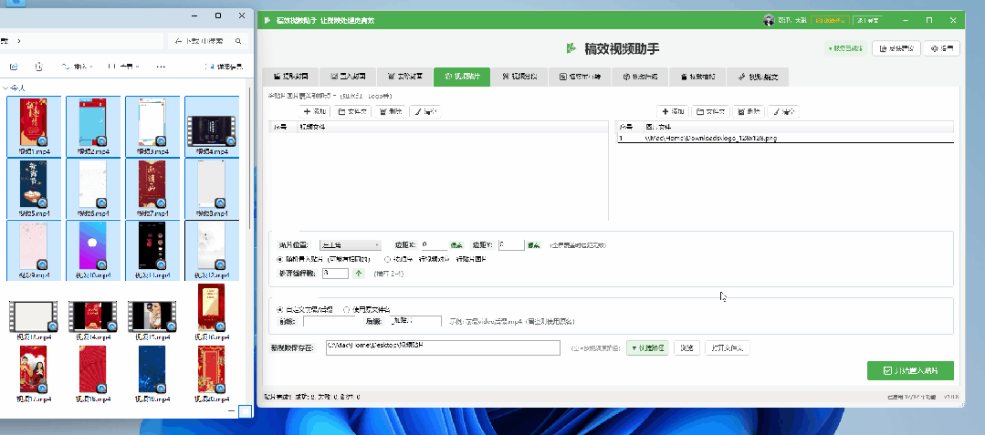 批量给视频叠加品牌 Logo、水印或贴片,支持全屏覆盖或自定义位置,可随机或按顺序匹配素材,既合规又高效。