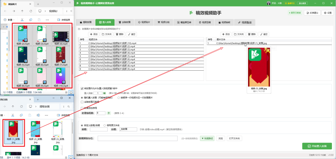 批量高效操作:一次添加多组视频和封面,统一设置规则,调节处理线程数,一键批量置入,多视频处理秒完成。