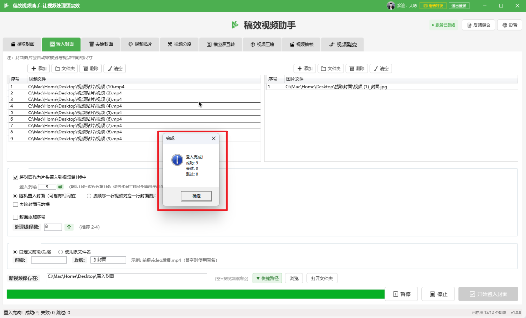 确认所有设置无误后,点击右下角「开始置入」,软件将自动批量为视频嵌入封面,进度条实时显示处理状态。